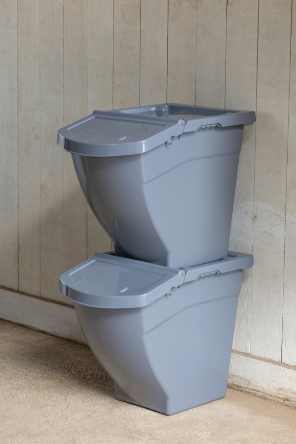 De stabelbare foderkasser er et genialt system til pladsbesparende opbevaring af foder eller lignende, med et innovativt lågdesign, der gør påfyldning og udtagning af foder både praktisk og legende let.