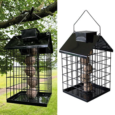 Smart fuglefoderautomat med værn, således at de store fugle ikke kan komme til, og de små fugle kan spise i fred og ro. Automaten er fremstillet i sort pulverlateret stål og har drænhuller i bunden så regnvand kan løbe væk. Bundplade er med 1 cm kant for minimering af foderspild.
